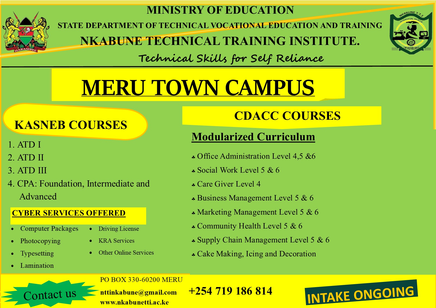Nkabune Technical Training Institute is a Government maintained institution located in Meru county four kilometers from Meru town,The institute offers technical, industrial, vocational and entrepreneurship training aimed at producing skilled manpower that fit in the dynamic Kenyan economy and the world at large. As an institute, we have a vision of being a center of excellence in offering technical, industrial, vocational and entrepreneurship training. We therefore, invite prospective student to join this institute for training in various courses